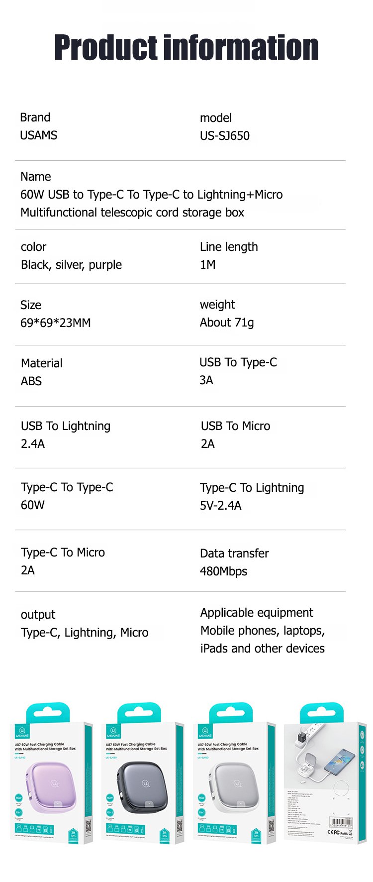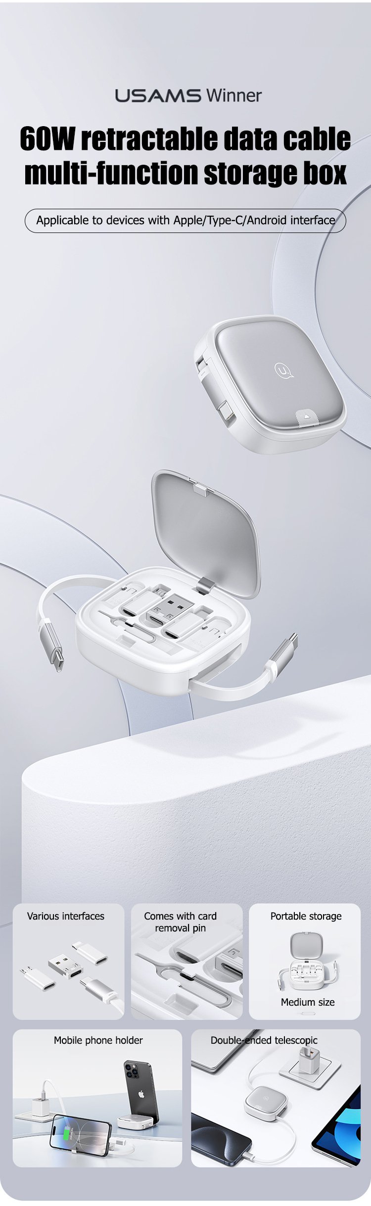 60W Retractable Data Cable Multifunctional Storage Box